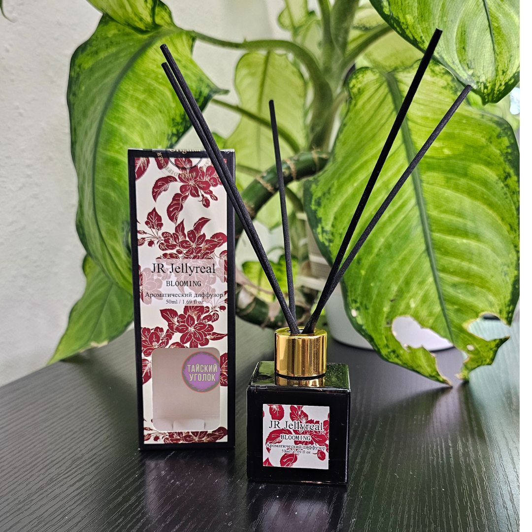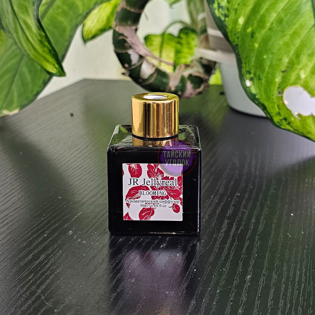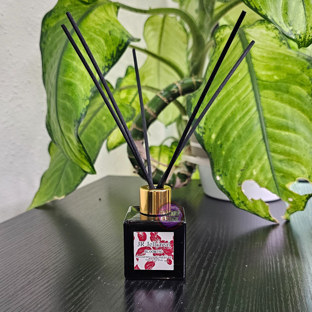 Ароматический диффузор JELLYREAL для дома с ароматом Blooming представляет собой стеклянную квадратную бутылочку с аромажидкостью, в которую вы вставляете ротанговые палочки.