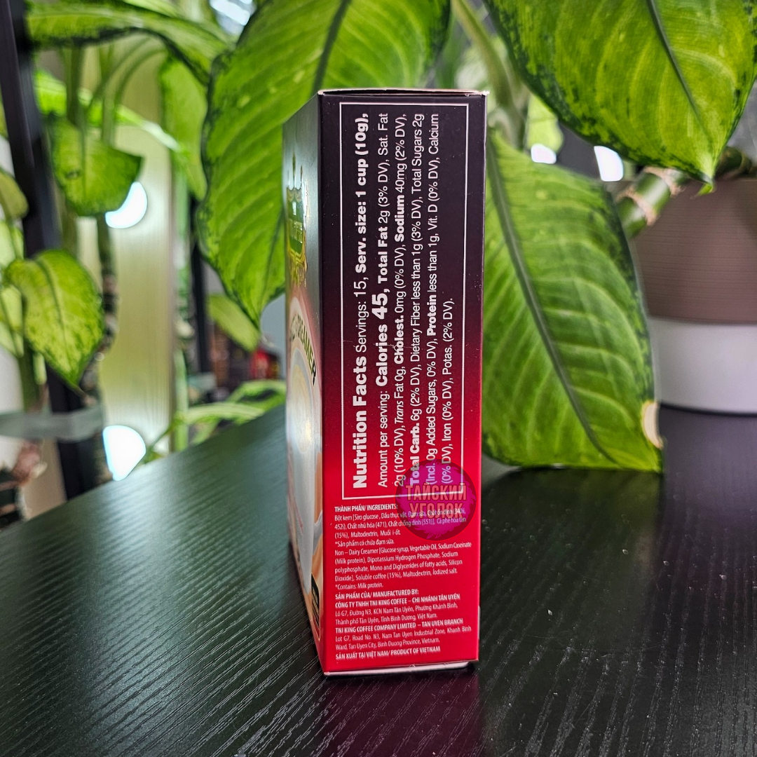 Кофе растворимый King Coffee Creamer уникален тем, что это кофе 2в1 — кофе и сливки. При этом сливки не молочные, а растительные. Обладает мягким, насыщенным, немного сладковатым вкусом, за счет содержания небольшого количества патоки.