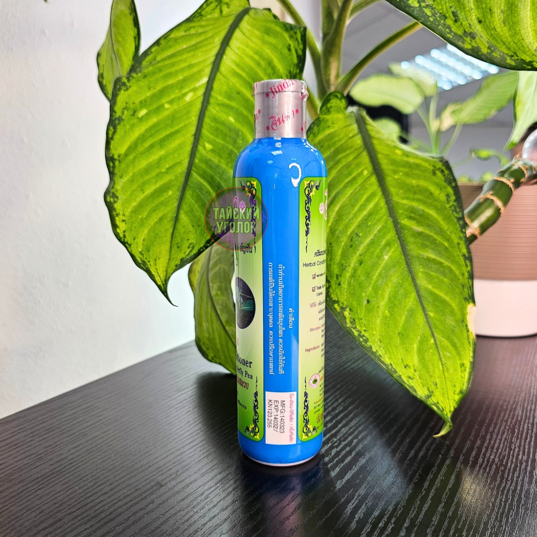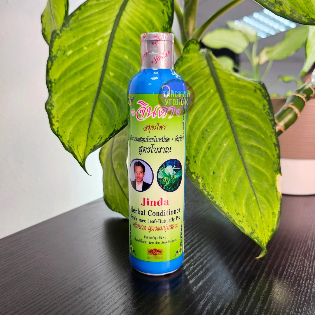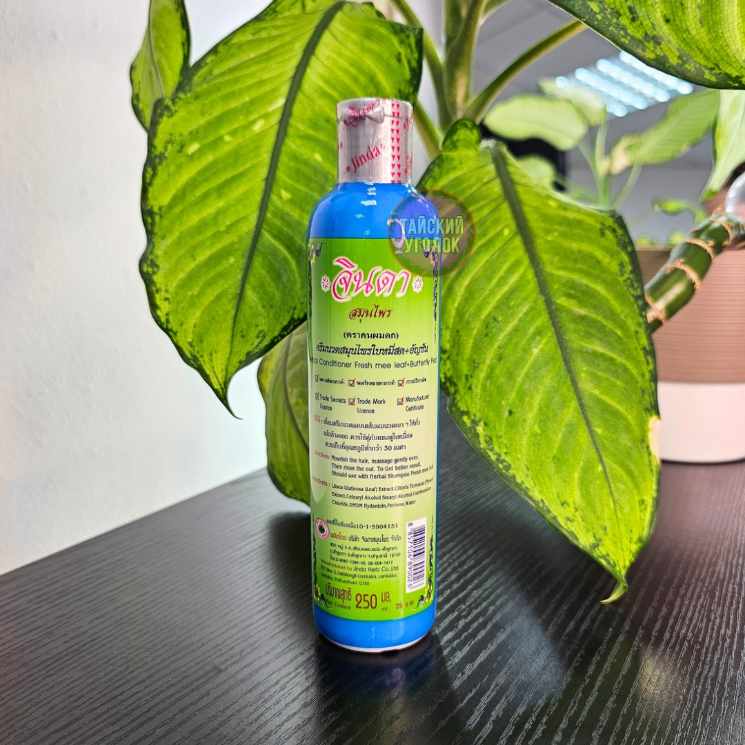 Эффективный кондиционер против выпадения волос Jinda Herbal Conditioner Fresh mee leaf + Butterfly Pea объемом на основе секретного рецепта из тайских трав активно восстанавливает структуру локонов и останавливает их выпадение, а также оказывает лечащее воздействие на пряди, делая шевелюру густой, крепкой и блестящей. Действие препарата усиливается при одновременном использовании с шампунем Jinda.