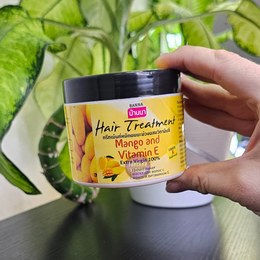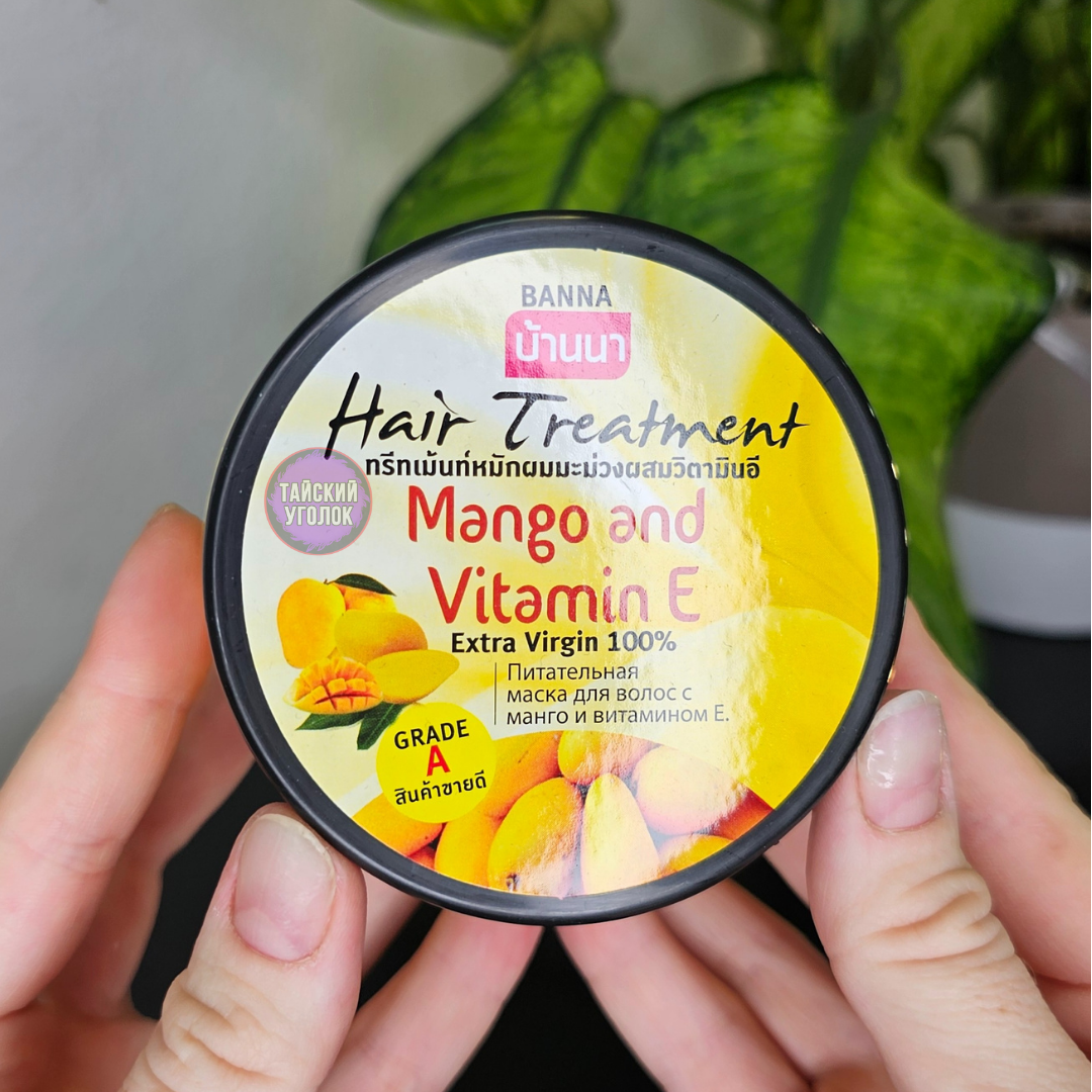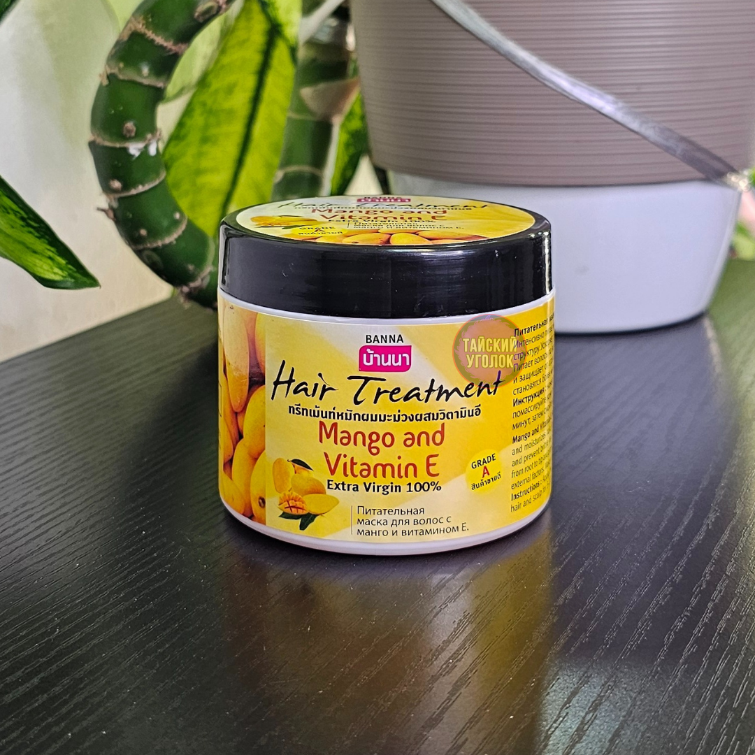 Бальзам-маска для волос с манго и витамином Е Hair Treatment Mango and Vitamin E, 300 ml тайской фирмы Banna восстанавливает нормальный рН баланс кожи головы, обладает сильным антиоксидантными свойствами и помогает сохранить естественный цвет волос. Глубоко питает от корней до самых кончиков, решая проблемы поврежденных, сухих и секущихся волос, делая их здоровыми, сияющими и послушными. Эффективно защищает от воздействий солнечных лучей, создает защитную пленку на волосах и препятствует их спутыванию. Маска так же восстанавливает структуру волос после химических воздействий.