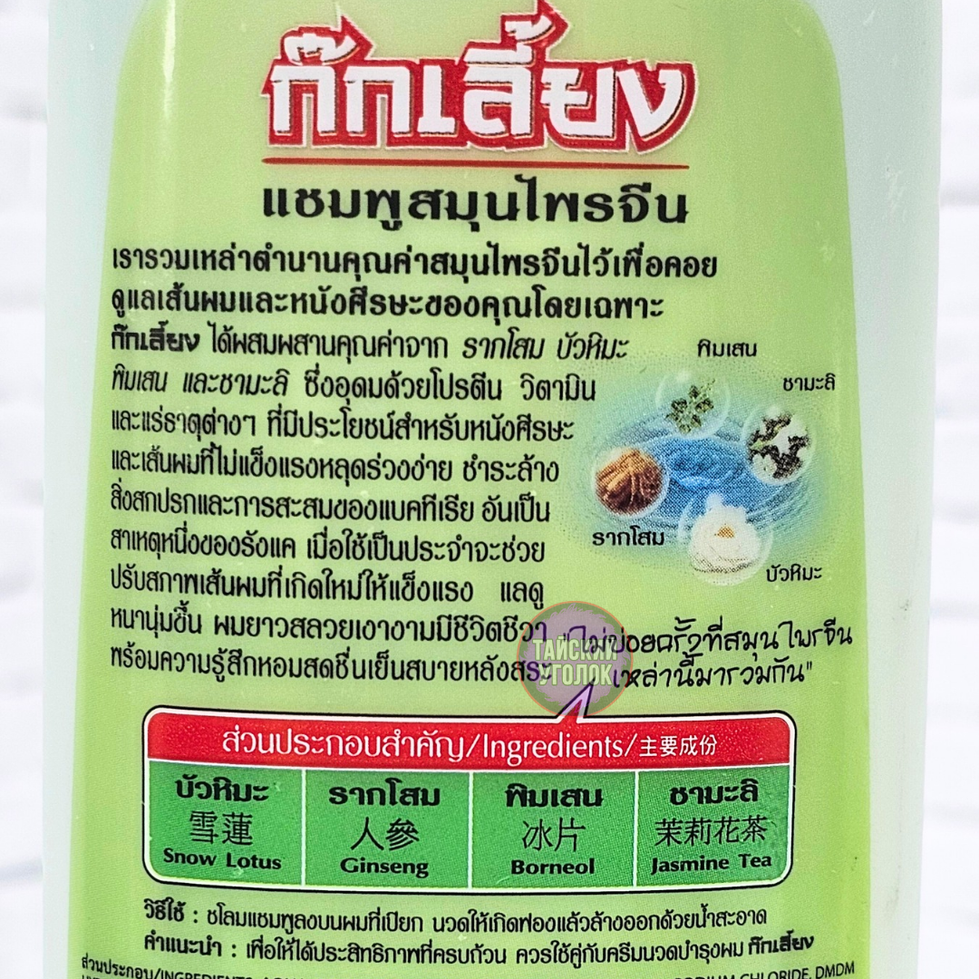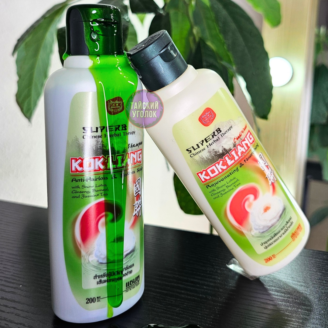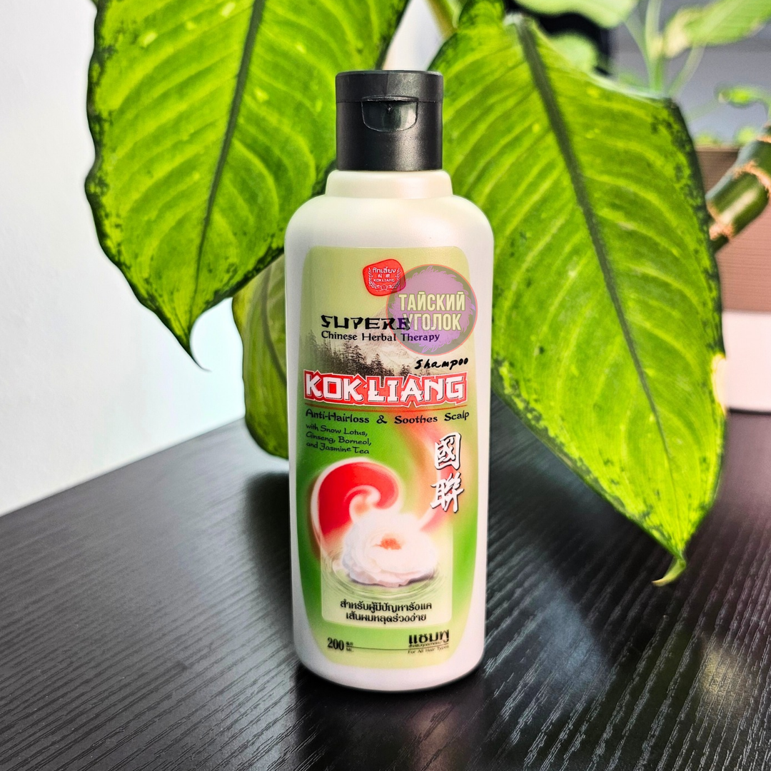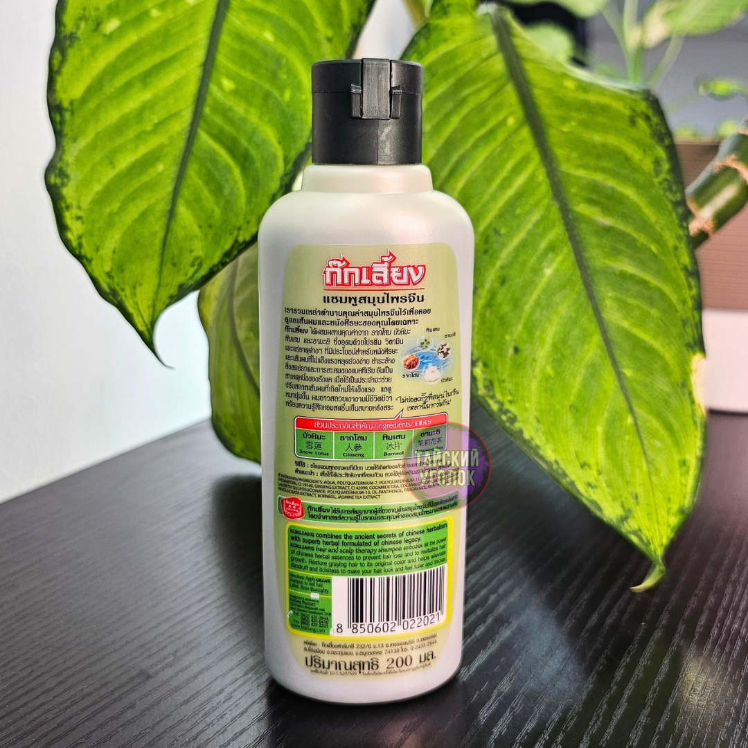 Тайский шампунь Kokliang (Коклианг) воплощает в себе всю мощь китайских травяных эссенций для предотвращения выпадения волос и для оживления их роста, смягчает кожу головы. Восстанавливает седые волосы до их первоначального цвета, борется с перхотью, снимает зуд. При регулярном использовании волосы выглядят густыми, блестящими и здоровыми. Не содержит в составе сульфатов и парабенов.